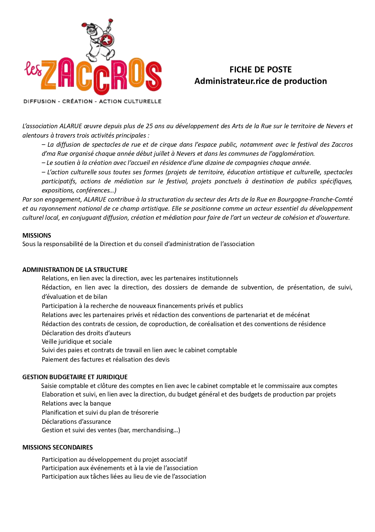 L’association ALARUE, porteuse du festival Les Zaccros d’ma Rue et engagée depuis plus de 25 ans dans le développement des Arts de la Rue, recherche un·e Administrateur·rice de production pour accompagner son projet artistique, ses résidences et ses actions culturelles sur le territoire.