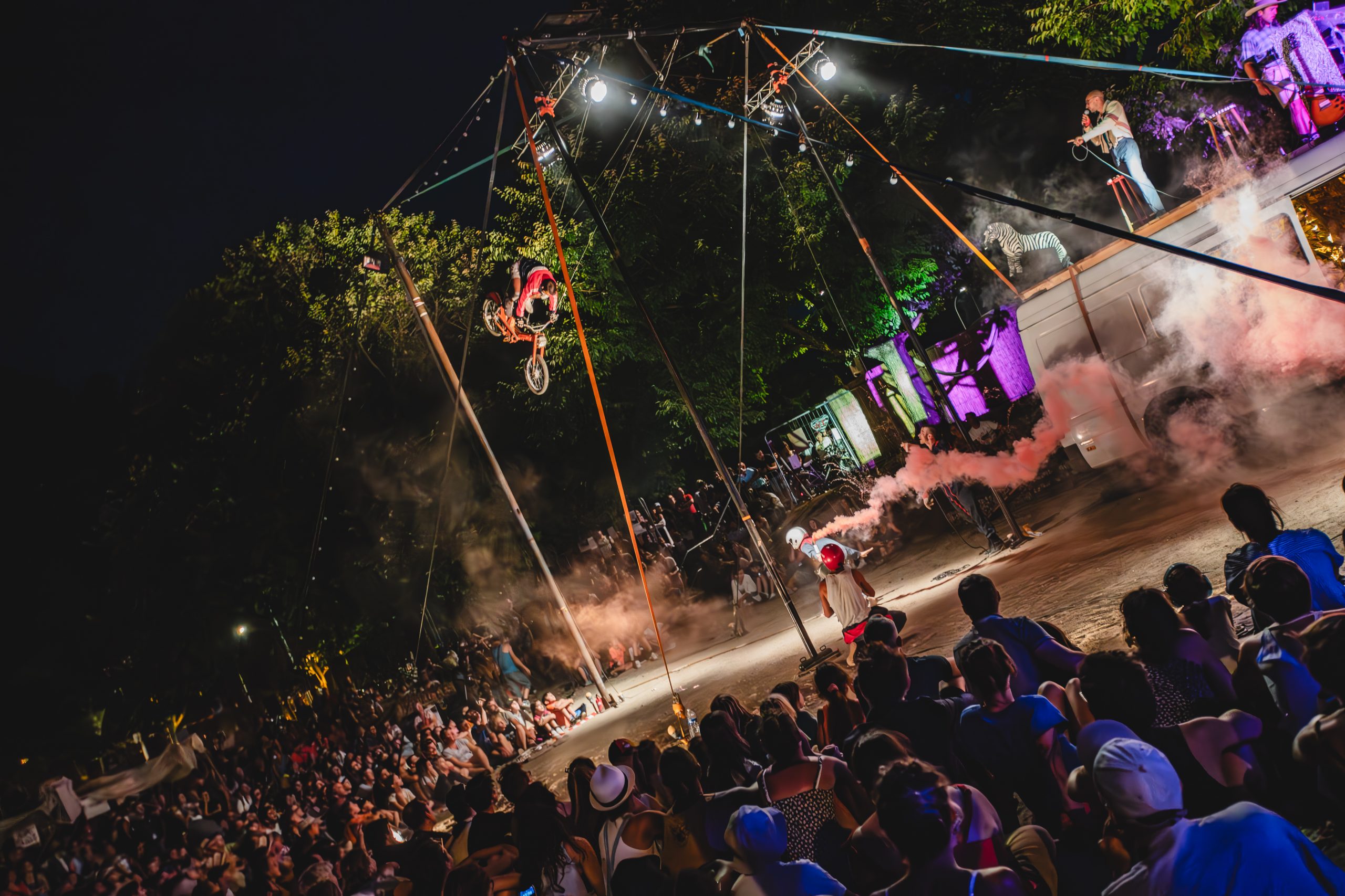 Initialement conçu sous la forme d’une performance acrobatique occasionnelle, ce projet s’est finalement transformé pour laisser place à la création d’un spectacle, entre cirque, théâtre et feu d’artifice.